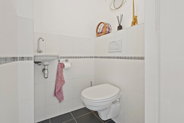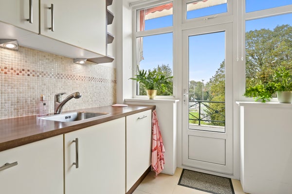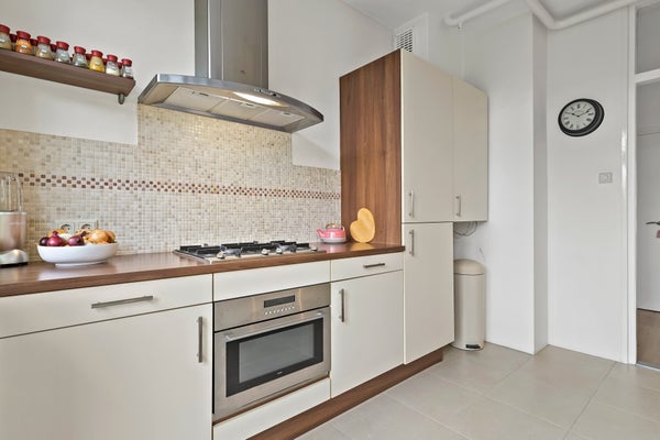 Kitchen located at the front with various built-in appliances such as fridge / freezer combination, oven, 4-burner gas hob with combination microwave / oven (Atag), extractor hood, Bosch dishwasher and a built-in Bosch washing machine. Installation location CV Remeha Avanta combi boiler 2021 (owned). Through the kitchen access to the lovely balcony located on the southwest (afternoon / evening sun) with sunshade and unobstructed and green view.
