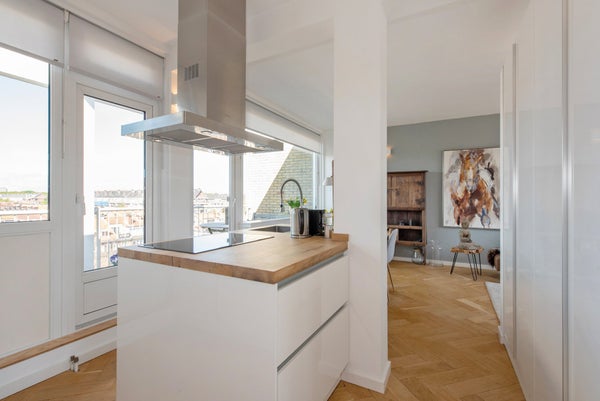 There is access to the fourth floor via stairs or elevator and access to the fifth (top) floor via stairs; entrance apartment, hall/corridor with access to storage cupboard and access to all rooms; modern toilet with fountain; access to the modern living room with oak herringbone floor, open kitchen, with access to the spacious deck terrace at the front, large windows on 2 sides for beautiful light, a modern beautiful white high-gloss kitchen with fridge and freezer, oven/ microwave, dishwasher at height, trendy induction glass hob, circulation hood and milled sink in a cooking island with a dining table with chairs and a beautiful cupboard wall and dividing wall to the bedroom, located at the rear, with built-in cupboard, access to the spacious deck terrace at the rear and adjacent to the modern bathroom with walk-in shower, cupboard space and modern sink on furniture.