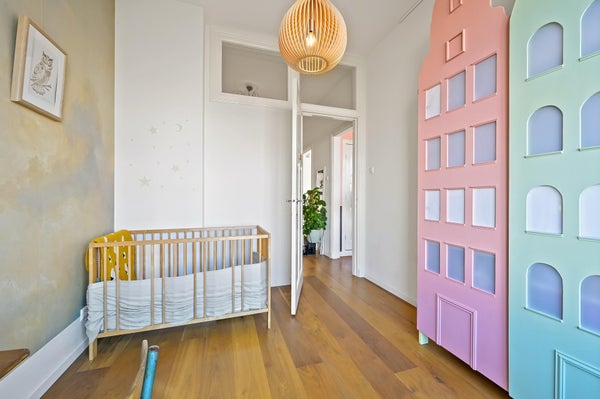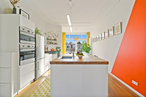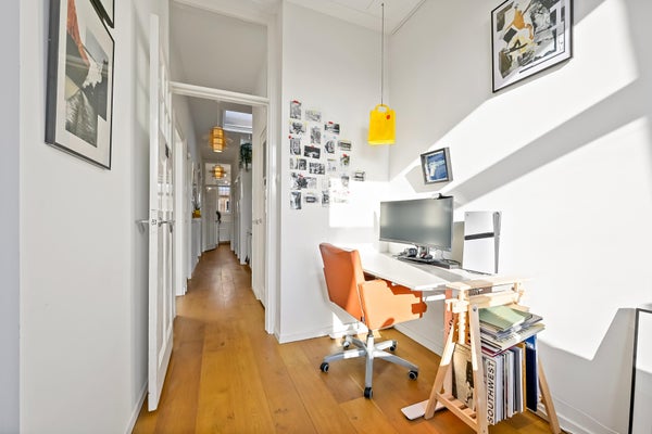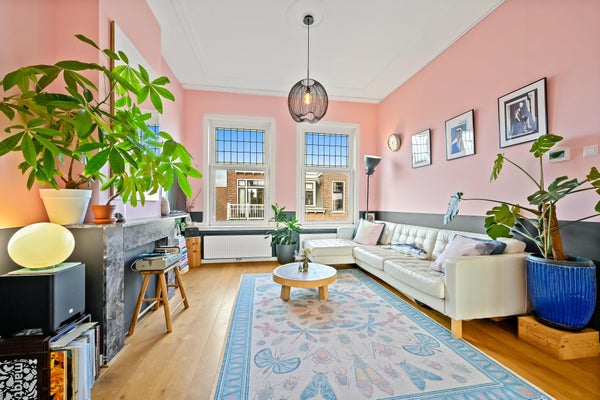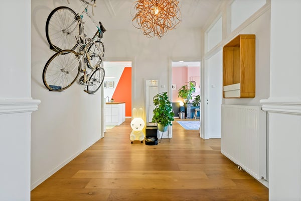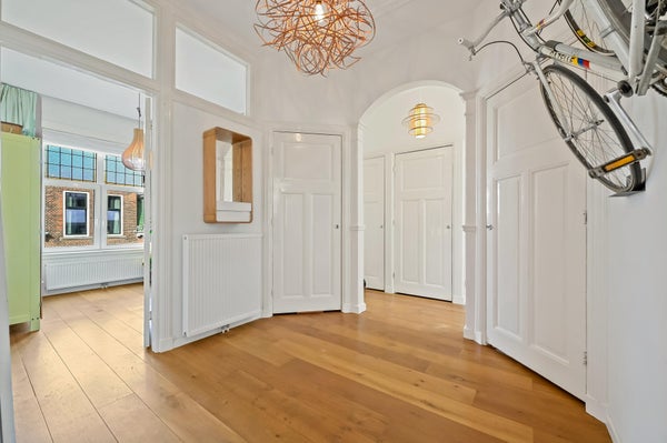 Layout: Open porch with wide stairs to the first floor. Front door, hallway with meter cupboard. Stairs to the second floor. Landing with access to all rooms. Toilet with hand basin and three built-in cupboards, one of which houses the central heating system. Central hall with two built-in cupboards. En-suite living room with beautiful ornamental ceilings, sliding doors with stained glass, and marble fireplaces. Luxurious open-plan kitchen/diner at the rear with sliding doors leading to the sunny southeast-facing rear balcony. The balcony spans the entire width of the house and has an awning. The kitchen is equipped with SMEG appliances, a 4-burner gas cooktop, a built-in extractor fan, a large (pyro) oven, a combination microwave, and a Quooker. Two spacious bedrooms are located at the rear, one with French doors leading to the balcony. The bathroom features a walk-in shower, vanity unit, heated towel rail, and connections for a washing machine and dryer. The third and fourth bedrooms are located at the front.