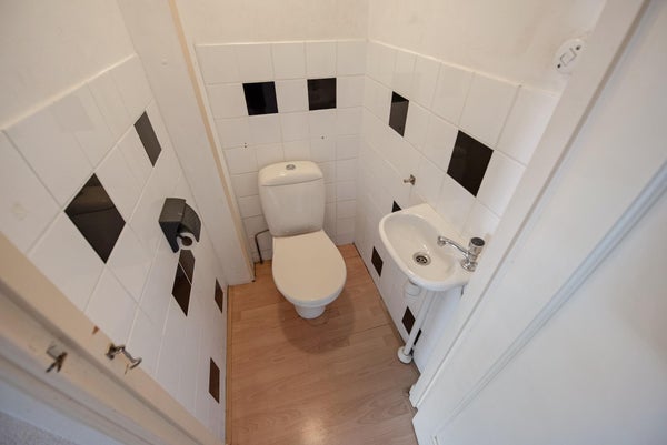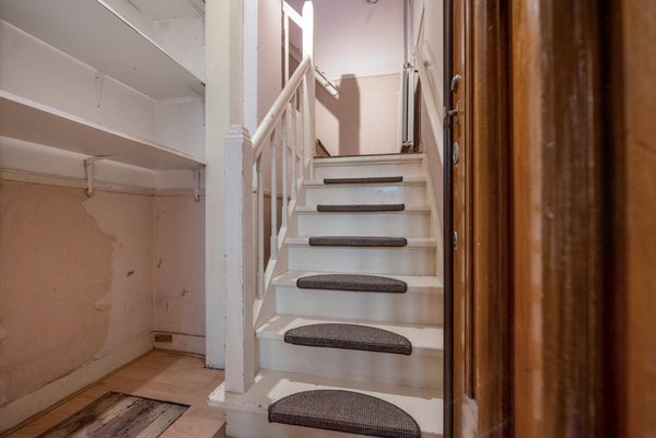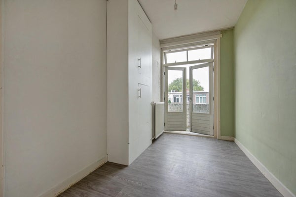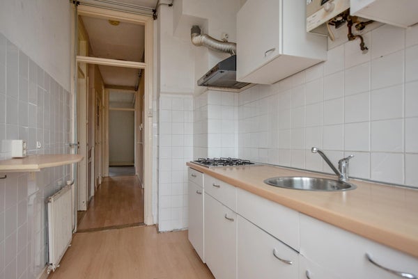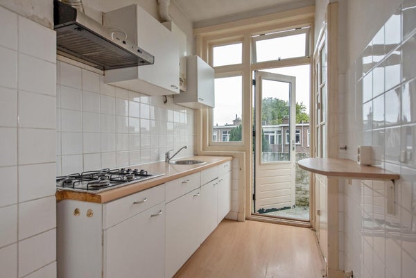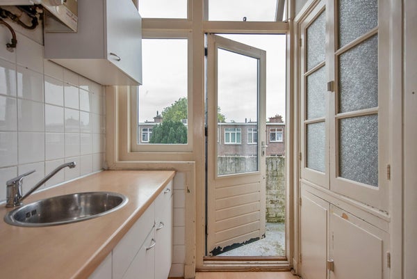 Layout: open Hague porch with stairs to the first floor; entrance house with storage space for bicycle, pram etc.; internal staircase with landing to second floor; landing with access to all rooms; toilet; living and dining room (broken through rooms ensuite) with a bay window at the front; kitchen, located at the rear, equipped with countertop, upper and lower cabinets, china cabinet, hob, extractor hood and access to the rear balcony, located on the northwest, equipped with balcony cupboard; bedroom, located at the rear, with access to the sunny balcony through patio doors; shower room, equipped with a shower and sink, wall and floor tiling and washing machine connections; bedroom, located at the front;