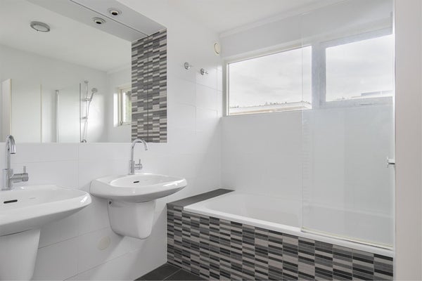 Ligbad, dubbele wastafel, toilet, wastafelmeubel