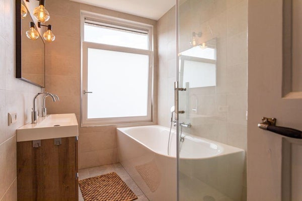 Ligbad, dubbele wastafel, vloerverwarming geheel, inloopdouche, wastafelmeubel